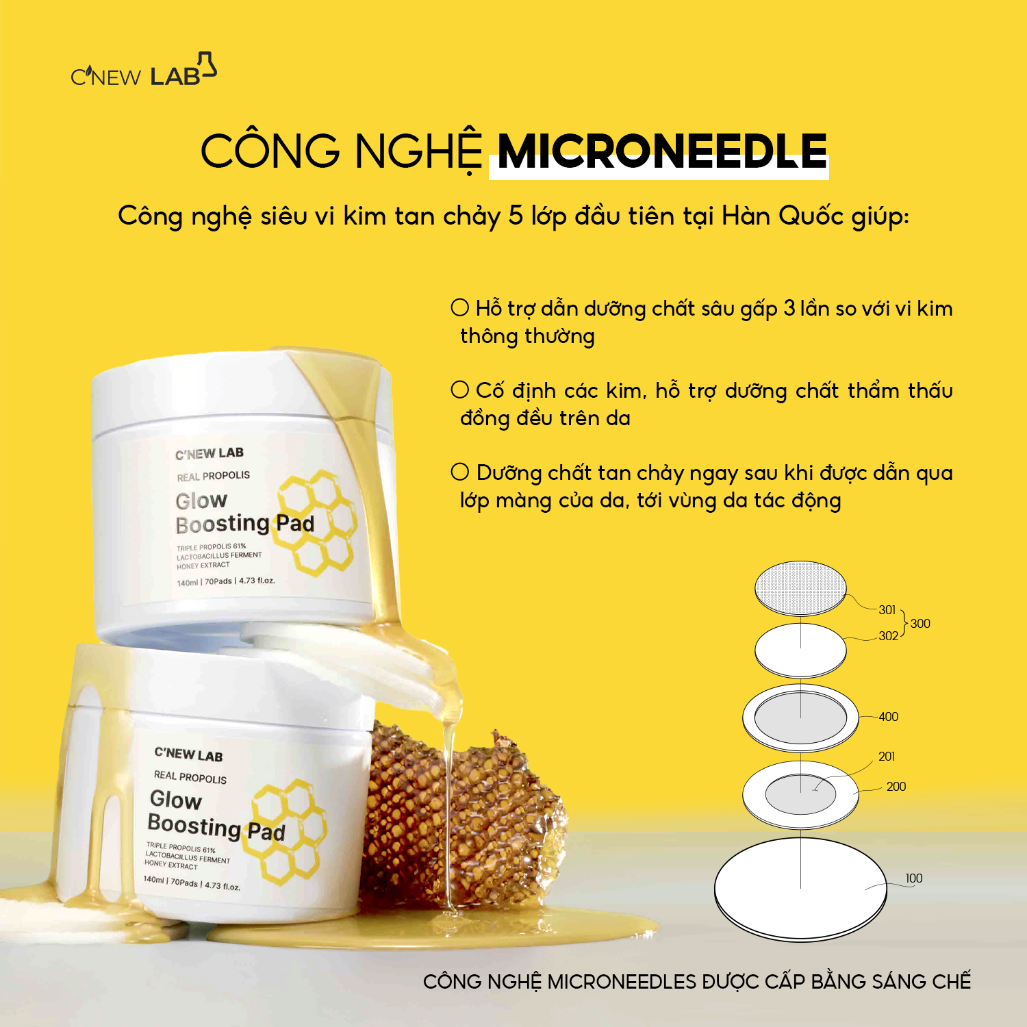 - Allantoin: chữa lành, làm dịu những tổn thương của da Ưu điểm nổi bậtTổ hợp 3 loại keo ong (Đen + Đỏ + Xanh) hàm lượng cao đến 61%, cùng tinh chất mật ong lên men và men lợi khuẩn Lactobacillus được đặt trong miếng TonerPad (bản quyền) hỗ trợ cấp ẩm, dưỡng sáng và làm dịu da hiệu quả hơn.Thiết kế dưới dạng Toner Pad. Một mặt 3D có tác dụng hỗ trợ loại bỏ tế bào thừa, làm sạch sâu với công nghệ Microneedle (siêu vi kim tan chảy 5 lớp) hỗ trợ các tinh chất thẩm thấu sâu gấp 3 lần so với vi kim thông thường. Một mặt phẳng có công dụng như lớp mặt nạ, hỗ trợ cung cấp các dưỡng chất đa tầng cho da. Được chứng minh hỗ trợ cải thiện 129% hàng rào bảo vệ da sau 1 lần dùng. Đối tượng sử dụng