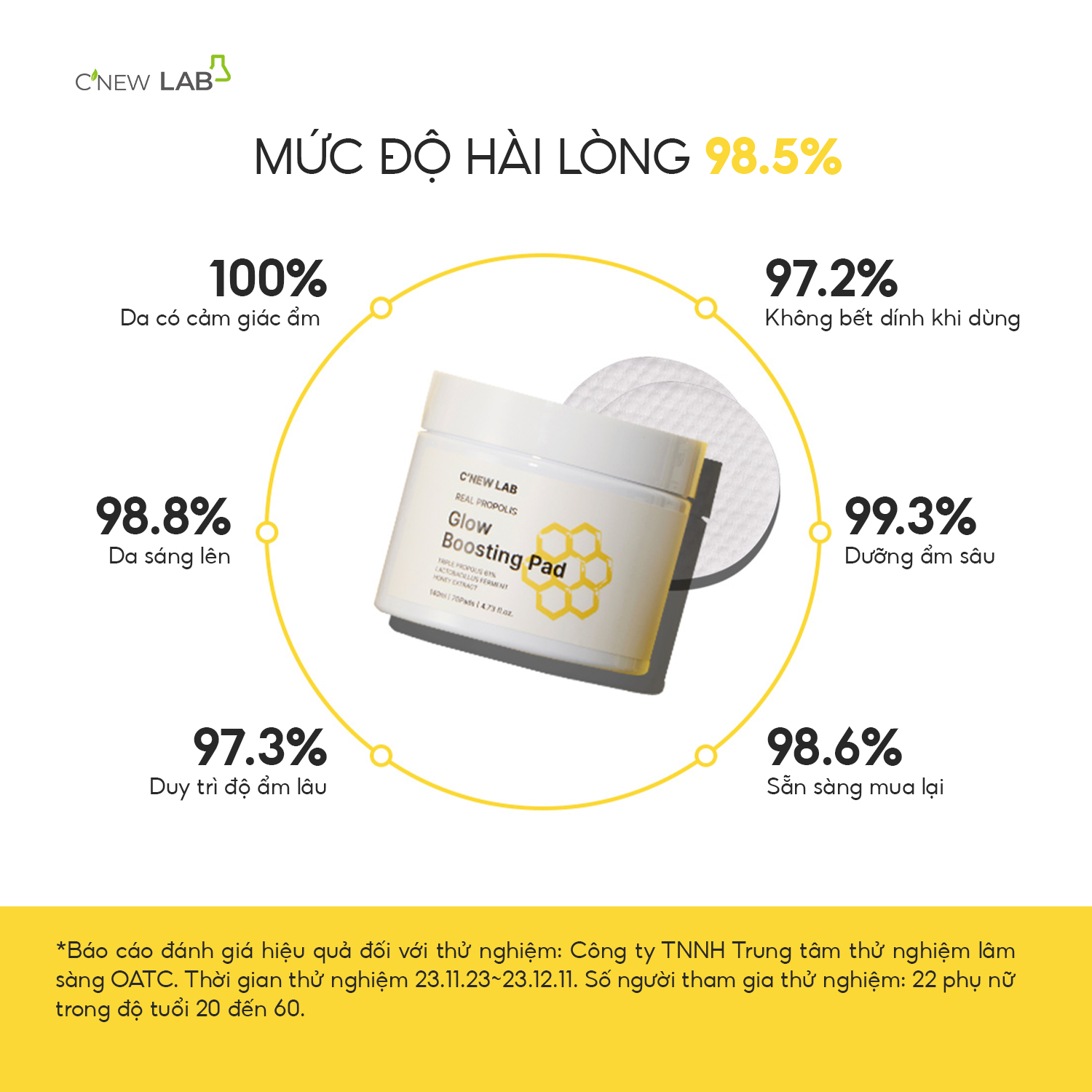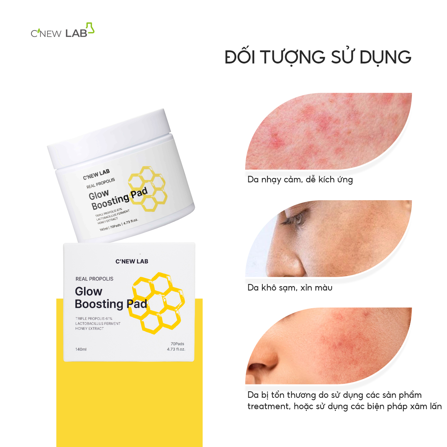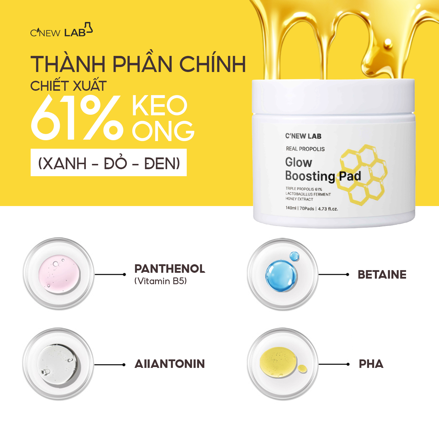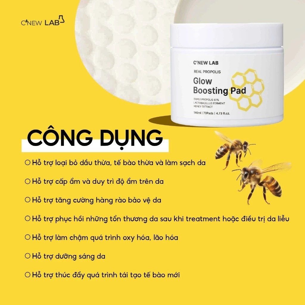 TonerPad tinh chất keo ong đích thực C’New Lab Real Propolis Glow Boosting Pad là sự kết hợp đặc biệt của tổ hợp 3 loại keo ong (xanh – đỏ – đen) hàm lượng cao đến 61%, cùng chiết xuất mật ong lên men và Lactobacillus, mang đến khả năng hỗ trợ cấp ẩm, dưỡng sáng và làm dịu làn da từ bên trong.